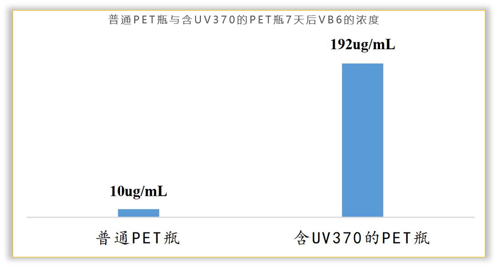关键性能: 在室外自然光条件下,检测含UV370的PET 瓶和普通PET瓶内的VB6含量,经过7 天光照,普通 PET 瓶内VB6浓度仅剩10μg/mL,而含UV370的PET瓶仍高达 192μg/mL,防护力一目了然。
