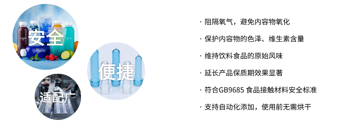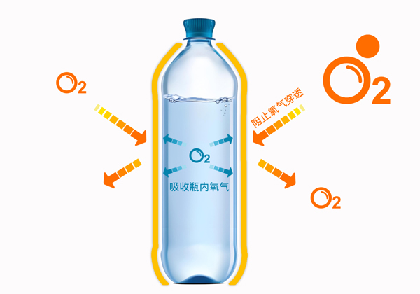 外阻氧气:高浓度吸氧母粒均匀分散、拉伸于瓶壁中,形成致密的阻隔层,避免氧气直接穿透瓶壁,延缓外部氧气渗透。