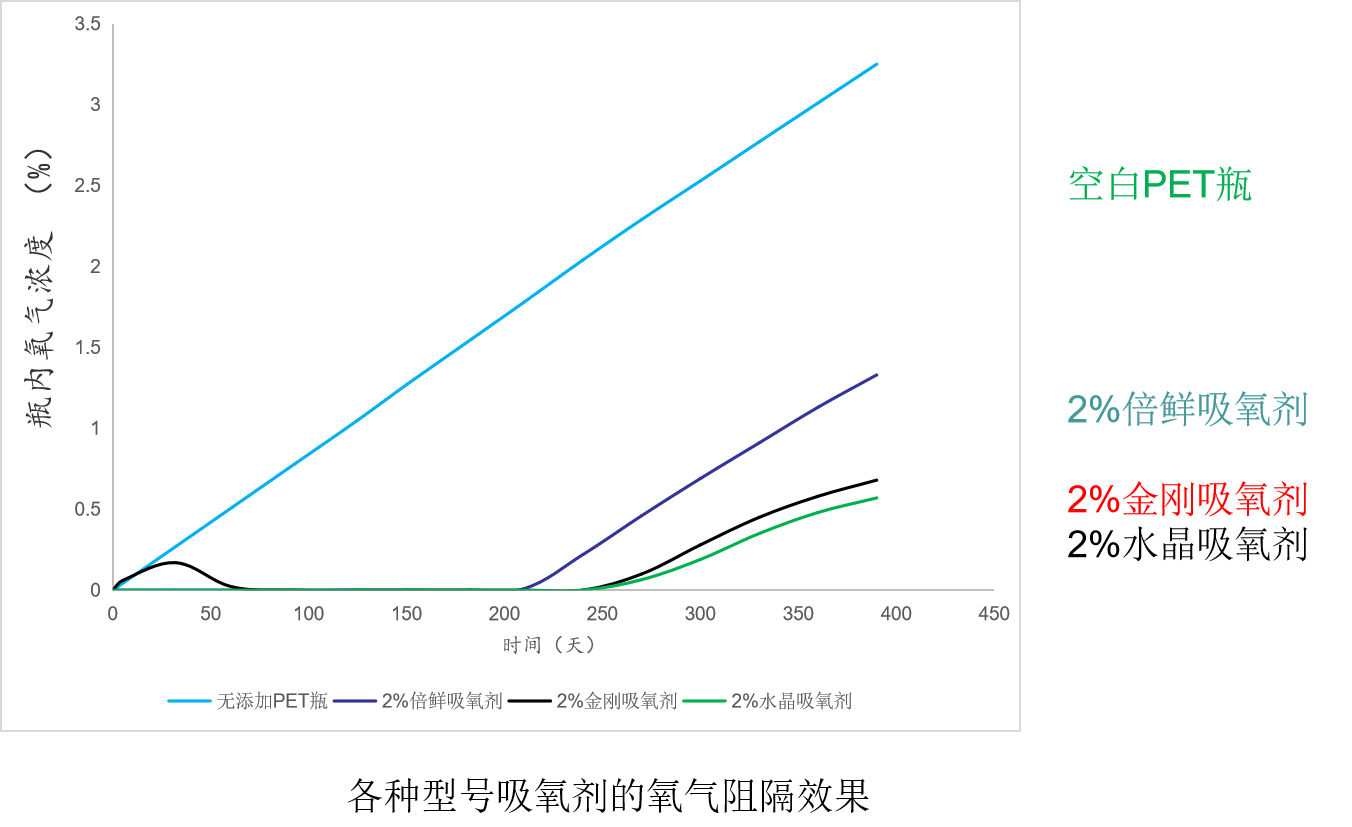 图中展示空白 PET 瓶、2% 倍鲜吸氧剂、2% 金刚吸氧剂、2% 水晶吸氧剂四种情况。体现不同吸氧剂对瓶内氧气浓度控制的差异。