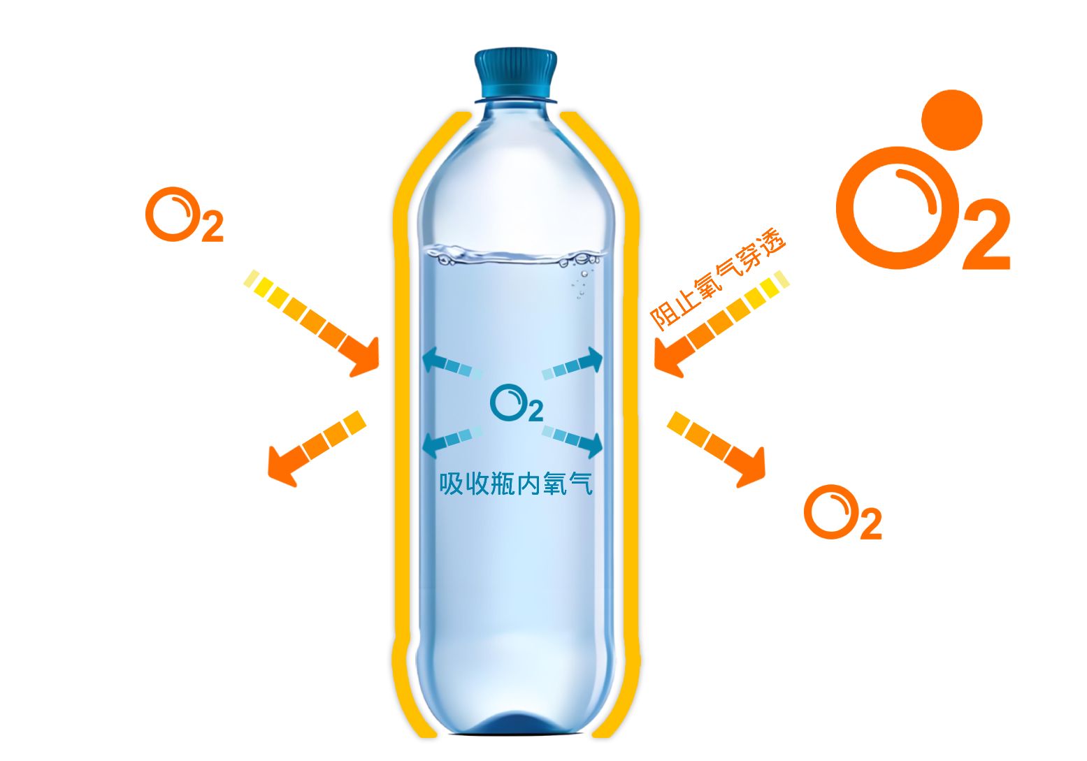 该技术是一种将吸氧活性成分高度浓缩于聚合物载体中,通过共混吹塑成型实现瓶壁集成的技术。其主要提供化学反应和颗粒拉伸来完成主动和被动吸阻氧。